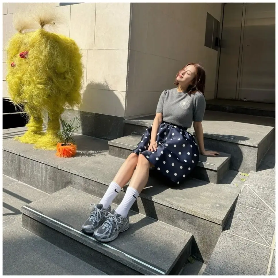 색상은 초반에도 언급했듯이 메탈릭 실버를 추천합니다. 요즘 트렌디한 색깔이기도 하고, 강소라 씨가 치마와 함께 코디한 사진을 보면 두말할 이유가 없습니다. 아래 강소라 씨가 착용한 모델은 M1906REH 입니다. 맨 오른쪽이 착용한 신발의 디테일한 시진인데요. 발매가는 179,000원으로 컬러감이 매력적인 아이템입니다.