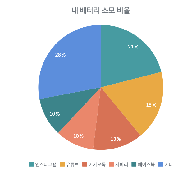 분석 결과, 평균적으로 상위 5개 앱이 전체 배터리 소모의 72%를 차지했습니다. 아래 표는 최근 1주간 내 아이폰 데이터를 바탕으로 한 앱별 배터리 소모 비율 예시입니다.