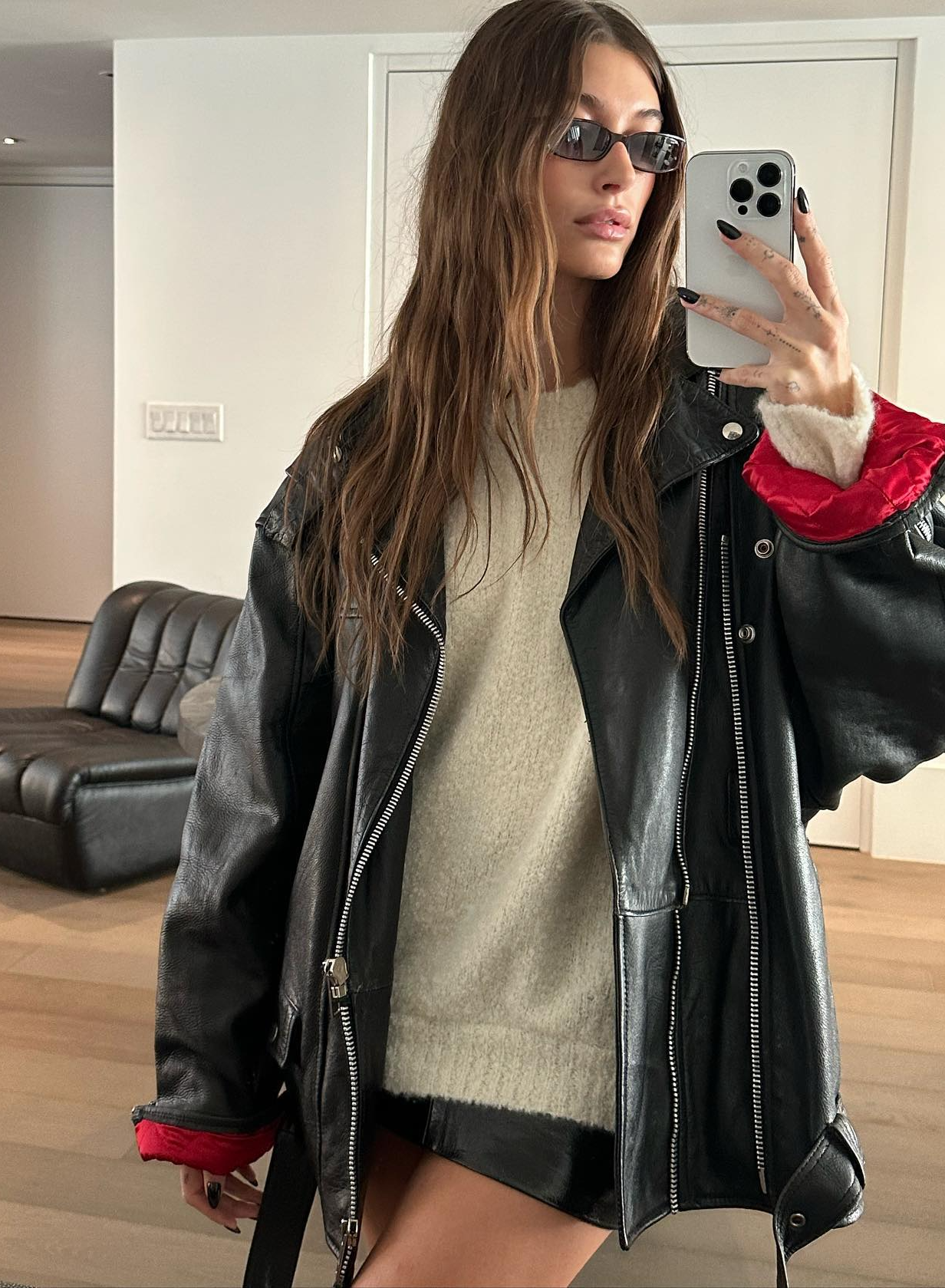 가죽 자켓을 가장 자주 입고 멋지게 입는 셀럽 바로 ‘헤일리 비버’ 착용을 보시죠. 셔츠를 이너로 활용할 때는 오버사이즈 셔츠보다 슬림핏 셔츠가 더 세련되어 보입니다.